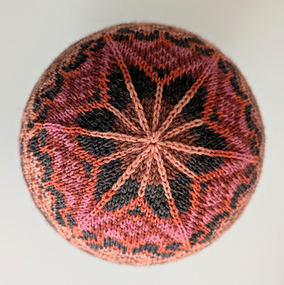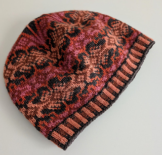 The orange/pink version (bottom photos) of this hat was made with natural dyed yarns from my kitchen.