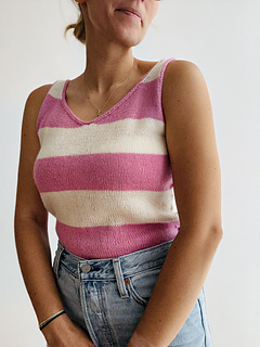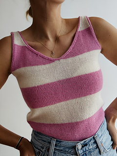 The bodice of the top is first worked in stockinette stitch with statement stripes in the round. When the armholes are reached, back and front part are separated and the two panels are finished off separately, but still in stockinette stitch back and forth in rows with statement stripes. First, the armholes are shaped with decreases. Then, front and back part are divided into two halves each and the V Neck is shaped along the front part and the back part.