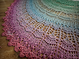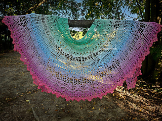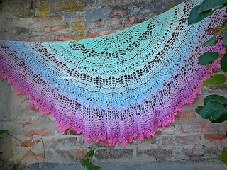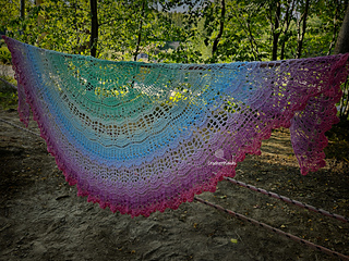 Crochet pattern for a half-round shawl. The pattern is designed for intermediate people, contains a graphic diagram divided into parts. Each row is unique. Yarn consumption depends on the size of the hook and the method of processing (tight or loose) - the shawl requires skeins of about 1400-1600m.
