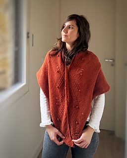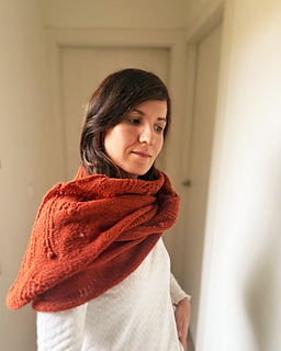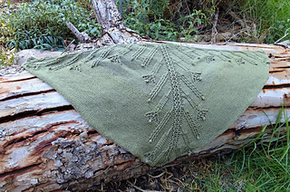 The shawl is constructed starting from the central part. The increases are combined to create the triangular shape as shown in the image below, all surrounded by an i-cord edge all the way around. The shawl is symmetrical with the vertical axis.