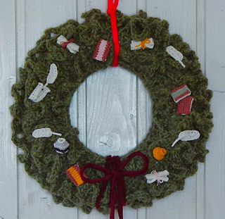 The “Jane Austen Wreath” is quick and easy to knit. There are 3 variations, all included in this pattern. A ready-made polystyrene wreath is used as the base, but you can also use a straw wreath. Finally, the decorative cord with tassels is made and tied around the wreath.