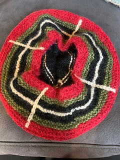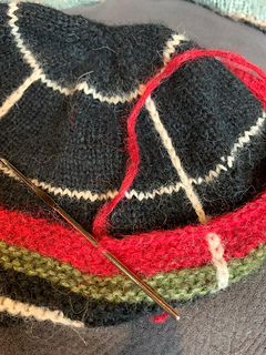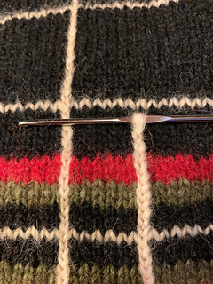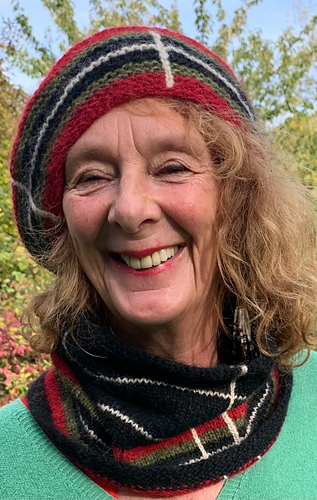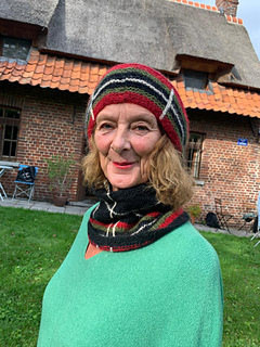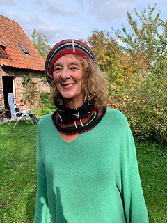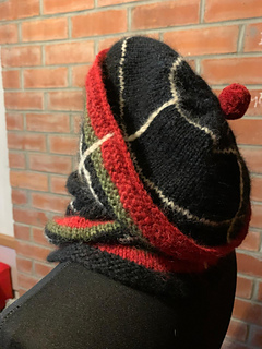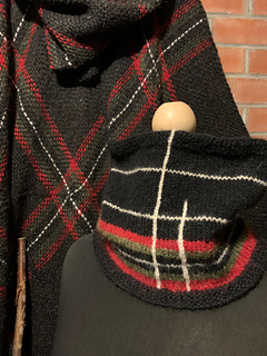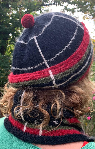 De cowl is iets smaller bovenaan dan onderaan. Zo valt hij mooi op de schouders. Ook de boord van de baret is smaller en gebreid in het tartan-motief. De schattige, kleine pompon (of toorie) geeft de baret dat typische Schotse karakter.