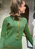 The pattern uses two colours, French Green and Orient Green, of Patons Cameo Crepe (alternative: Jade and Green of Patons Purple Heather 4-ply) and is worked flat over 8x8 stitches and rows. The bottom edge has a knitted hem, as do the facing button bands.