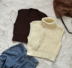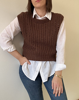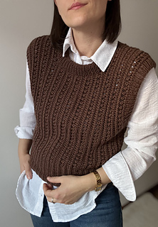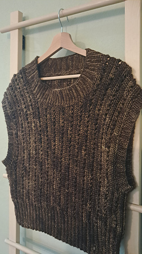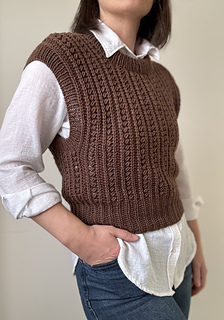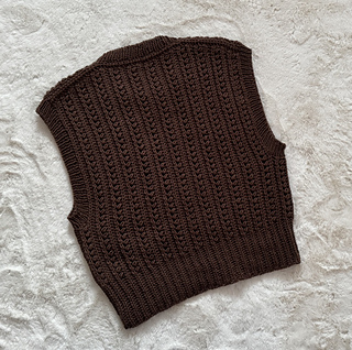 The neck and armhole edges are finished with ribbing, worked in the round on circular needles or double-pointed needles. Alternatively, the edges may be crocheted; both techniques are explained in the pattern.