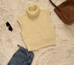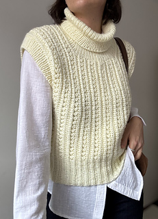 Option 1 (as shown in the white slipover with high neck): 2, 3, 3, 4, 4, 5 balls of Edith by Tessiland (1 ball = 100 g / 300 m).