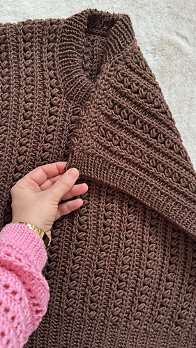 I bordi del collo e delle maniche si rifiniscono con coste, lavorate in tondo con ferri circolari o ferri a doppie punte. In alternativa, i bordi possono essere rifiniti all’uncinetto; entrambe le tecniche sono spiegate nel pattern.