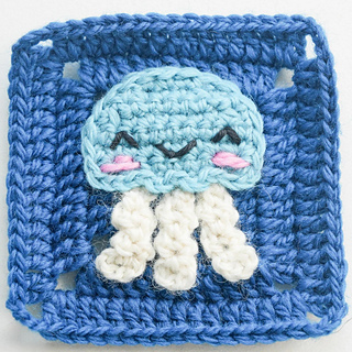 An adorable jellyfish with a rounded bell, sweet embroidered face with rosy cheeks, and curly tentacles on an ocean-blue granny square.