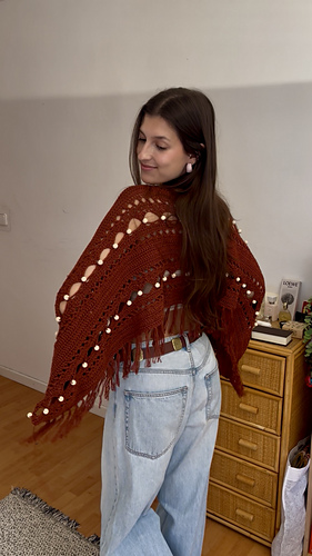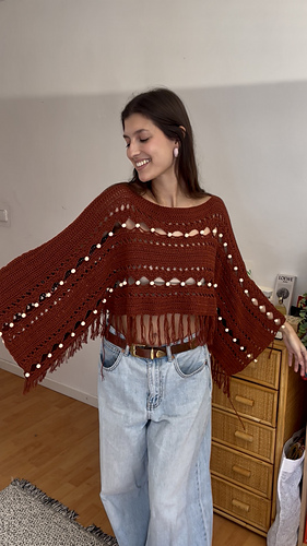 Esta prenda se trabaja de de arriba hacia abajo. Consiste en tejer dos rectángulos iguales en los que se irán añadiendo las cuentas o abalorios. Primero, se tejerá el delantero, y luego la espalda, sacando los puntos directamente de la primera pieza. Finalmente, coserás las dos piezas por el bajo y añadirás los flecos.