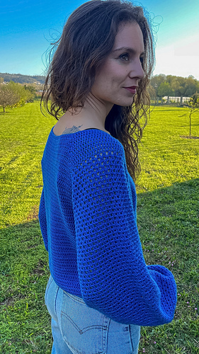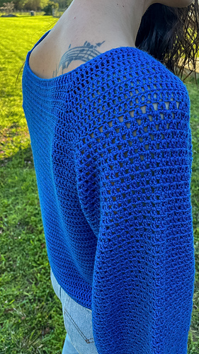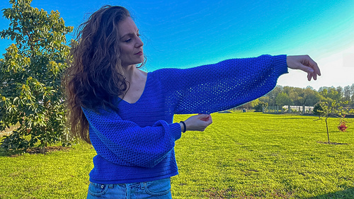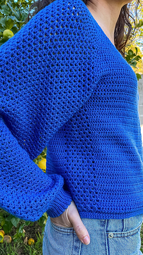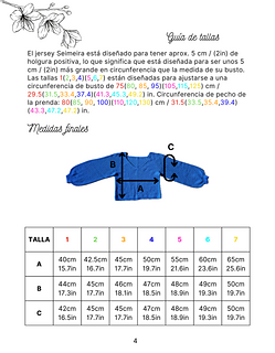 El jersey Seimeira es una prenda que se construye en una sola pieza con pasadas de ida y vuelta de arriba hacia abajo y canesú ranglán. Tiene el cuello en pico y un sencillo punto fantasía en las mangas y laterales.