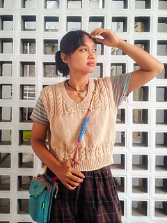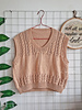 This vest has 2 length: cropped and regular. Vest is intermediate, using basic knitting, cable, grafting, pick up and knit, short row, and loose bind off.
