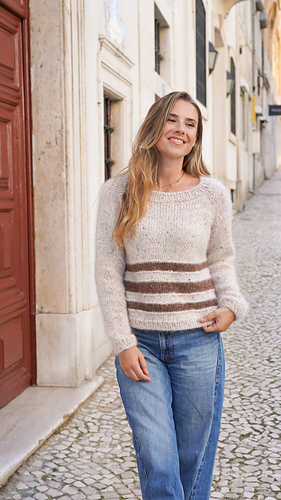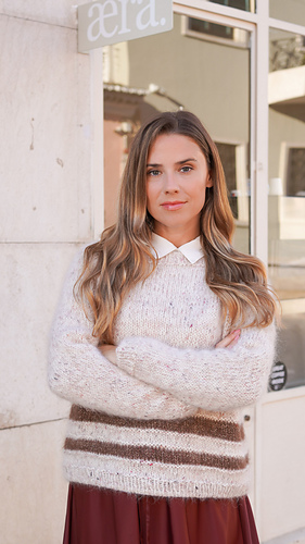 Nach dem Stilllegen der Ärmelmaschen wird der Rumpf in Runden gestrickt. Das besondere Highlight sind die eingefassten Streifen, die dem Sweater seinen einzigartigen Look verleihen. Anschließend werden die Ärmel gearbeitet, die sich durch sanfte Abnahmen elegant verjüngen – für eine moderne, leicht figurbetonte Passform.