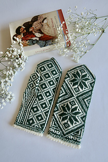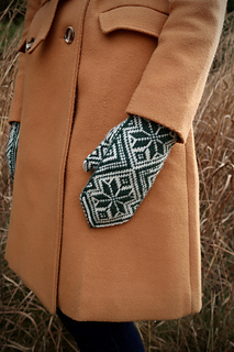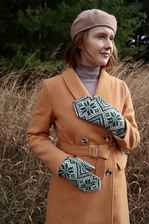 The motifs on Jo’s mittens are sharp (like her wit) and resemble the steel-nibbed ink pens that she uses to write her stories. Her design foregoes the extra Latvian braid in spirit of her tomboy roots. The palm and thumb are covered in bold, geometric, diamond lattice patterns.