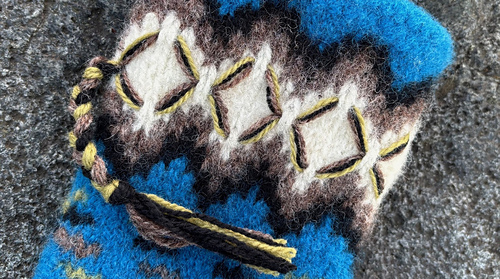 Vottene kjennetegnes med en bunnfarge, som kombineres med naturhvit og 3 andre farger. På mansjetten er det en lovikka-inspirert dekor, med dusk. I denne oppskrifta er det brukt bestemte farger, men vottene kan fint strikkes i andre fargekombinasjoner og gjerne i restegarn.