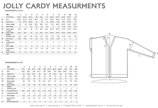 Designed to be worn with 3 - 5”/7.5 - 12.5 cm positive ease at the bust. If you are between sizes, size up for a more relaxed fit or size down for a more fitted look. Full schematic and finished measurements in images.
