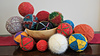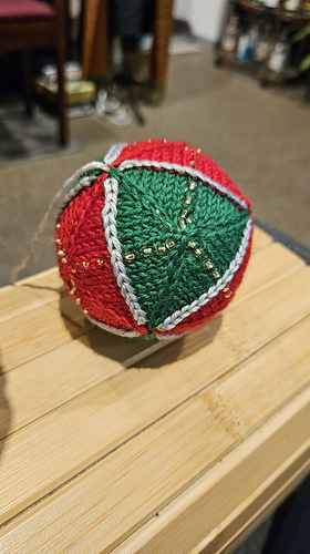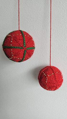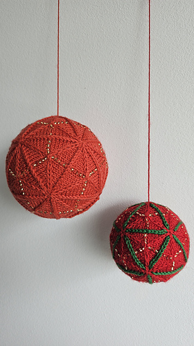 The balls are modular, made by knitting individual triangles and joining them using a flat version of the three-needle bind-off. There are photo tutorials of all techniques, as well as links to a full video tutorial on YouTube. The smallest ball needs only 5g of yarn, the largest 15g. Great for sock-yarn leftovers or mini skeins.