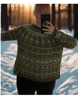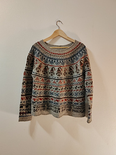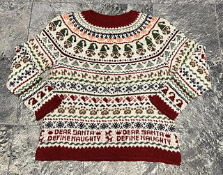A thin and light sweater with a dog theme and Christmassy ideas. The sweater is knitted from top to bottom without visible seams.