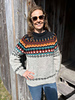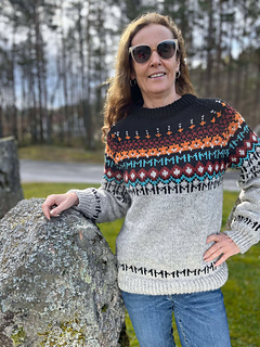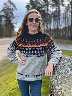 The Jor sweater is a colourful raglan design, knitted bottom-up in 5 colours using Hillesvåg Varde and Vidde yarn. The sweater in the picture is size M. The pattern is available in 7 sizes.