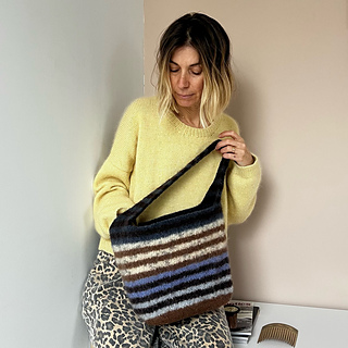 After knitting, the bag is felted in the washing machine, transforming the knitted fabric into a dense, durable textile that gives the bag its final structure and shape.