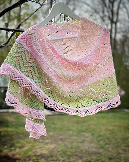 A light and airy crescent shawl, this shawl will easily become your go to accessory for cool evenings. Knit from the top down alternating two chevron patterns and using two skeins of fingering yarn, Joyful Crescent is a great way to use up those slow changing gradients in your stash. The sample is knit with Knitwits Freia Fingering Shawl ball and Blue Moon Fibers Super Sparkle.
