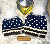 This pattern is knit in the round using super bulky yarn. The brim is in two colors and the base is one color with colorwork. Sizes are baby and adult so you can make a matching set, with a modification for toddler size as well. You can use three or four colors for this pattern. It uses size US 11 and US 13 needles.