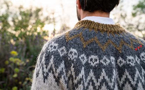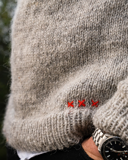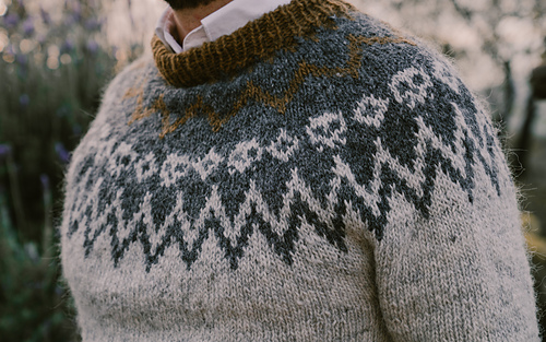 The Juki sweater is where tradition meets a healthy dose of bad ass attitude. The skulls and crosses worked on the yoke pattern blend in with more conventional motifs. The sweater is finished off with embroidered criss-cross stitches in a bright red colour, injecting a personal, unique touch. The sweater is worked bottom up in the round in Icelandic wool on 5 mm (US8) needles.