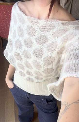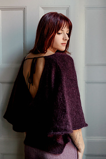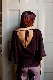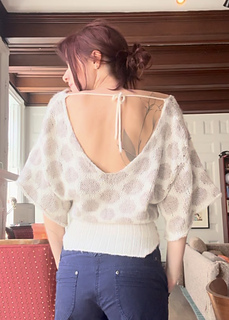 This is an elegant, three-quarter-length sleeve blouse with a tight fit around the waist, a slouchier fit around the bust and a low back. The waist section is first worked top down in 3x1 rib knit in the round. Then, you will pick up stitches to knit the body bottom up, switch to larger needles and eventually, split into a front panel and a back panel. You will work stockinette flat on the front panel while the back panel is on hold, adding several increase rows as you move up. You will then cast off the front panel and work the back panel with a low back. Once both panels are cast off, you will seam the shoulders together. You will then pick up the sleeves and knit stockinette in the round to three-quarter length. Finally, you will create an I-cord and attach it to the back of the blouse to be used as a tie. There are optional modifications such as adding buttons and polka dots.