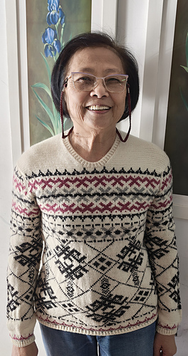 Techniques used: Lifted increases, stranded colourwork, Ladderback Jacquard, Backwards loop cast-on, knitting in the round, Tubular bind-off for 1x1 rib.