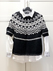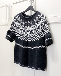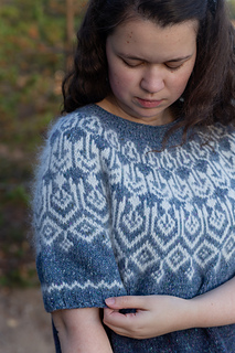 This jumper is knitted from top to bottom in a circle without seams. A neck depression is formed along the back. The round yoke is decorated with a jacquard pattern. The additions are distributed along the yoke in order to expand it and better fit the figure. Then the knitting is divided into a body and sleeves, they are also knitted in a circle.