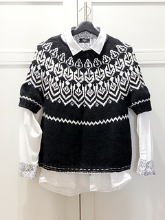 Этот джемпер связан сверху вниз по кругу без швов. По спинке сформировано углубление горловины. Круглая кокетка украшена жаккардовым узором. По кокетке распределены прибавления с целью ее расширения и лучшей посадки по фигуре. Затем вязание разделяется на корпус и рукава, они так же вяжутся по кругу.