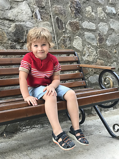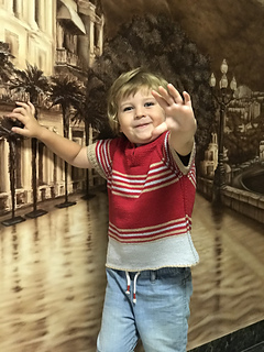 Детский хлопковый джемпер с коротким рукавом и застежкой-поло с полосками имеет бесшовную конструкцию – реглан. Связан сверху вниз. В описании приведен один размер на рост 104 см. Ширина изделия 35см, длина изделия 42см.