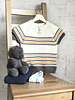 Children’s cotton jumper with short sleeves and a polo fastener with stripes has a seamless design - raglan. Tied from top to bottom. The description contains one size for the height 104 cm. The width of the product is 35 cm, the length of the product is 42 cm.
