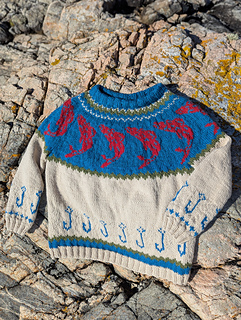 Inspired by the rugged coastlines and the fishing heritage of island life, the Jumping Salmon Sweater features a leaping salmon motif that dances around the yoke, framed by stylized waves and fishing hooks. This pattern pairs traditional Nordic-style colorwork with a fresh coastal twist. Perfect for knitters who love the ocean and timeless design.