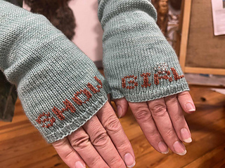The mitts are a simple knit in your favorite fingering weight yarn (I used my own hand dyed Happy Habit cashmere merino blend). I added the charted lettering in duplicate stitch with sparkle orange yarn and sewed a few beads over my left ring finger. You could adapt for stranded knitting, but I didn’t because I didn’t want to catch my fingers on the floats when putting the mitts on. I have kits with both yarns and beads in my store.