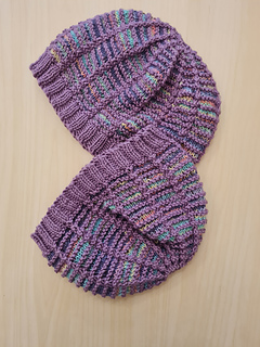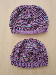 The hat is worked in the round, in slip-stitch using one ball of variegated DK and one ball of plain DK.