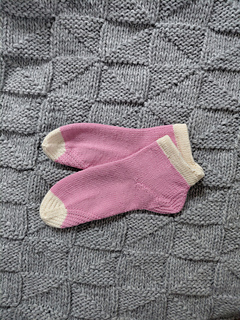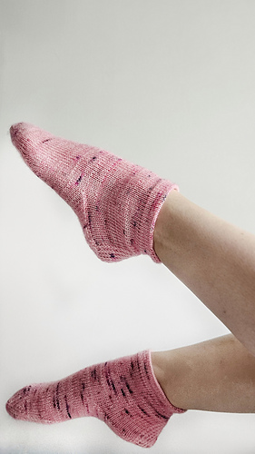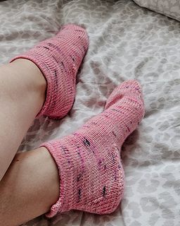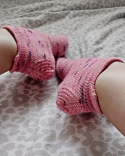 Just Meow Socks are short socks worked cuff down in stockinette stitch. Their only decoration is the strengthened diamond heel and sole construction details.