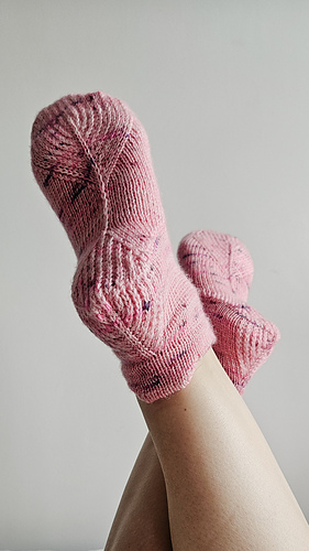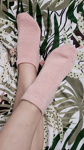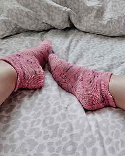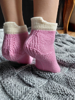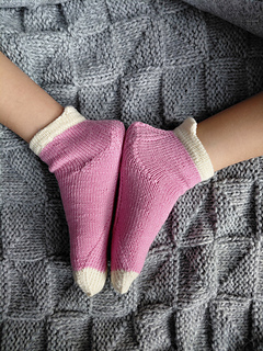 Just Meow Socks are short socks worked cuff down in stockinette stitch. Their only decoration is the strengthened diamond heel and sole construction details.