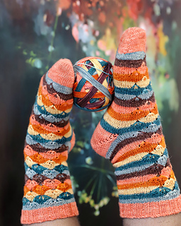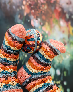 Taivaanranta Yarn Self Striping Sock (75% SW merino, 25% nylon, 425 m / 100 g), or other fingering weight yarn. Shown in colour Kaiku (MC) and Salmon (CC).