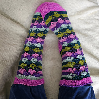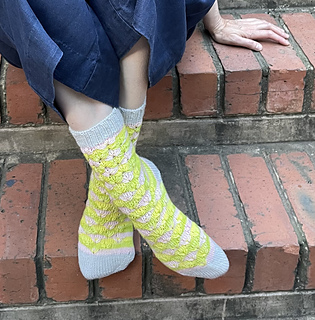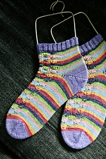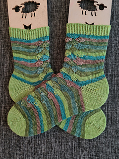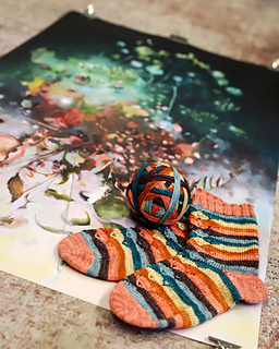 Kaiku is a fun sock pattern for self-striping yarn. The socks are worked toe-up and feature a short row heel. The instep has a cute embroidery stitch that works best for self-striping yarns with approx. 0.5–0.75’’ / 1–2 cm wide stripes. Solid colours work best for contrast colour. The pattern is written for magic loop technique, but you can work the socks with dpns if you wish.