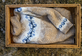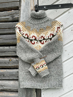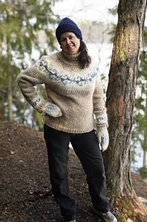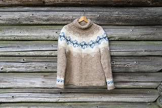 The pattern includes sizes S–XXL. After the seamlessly knitted yoke, the sweater is divided into sleeves and body. In sizes S–L, the colorwork pattern continues after the division.
