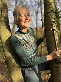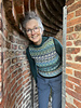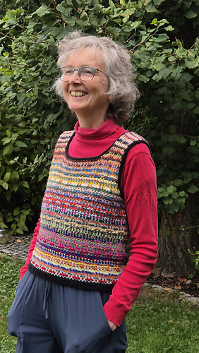 The pattern is styled for a square(-ish) neck or a boat neck. The square neck sample is knitted in every available colour, and the boat neck version is knitted using scraps of mostly greens, blues and greys.