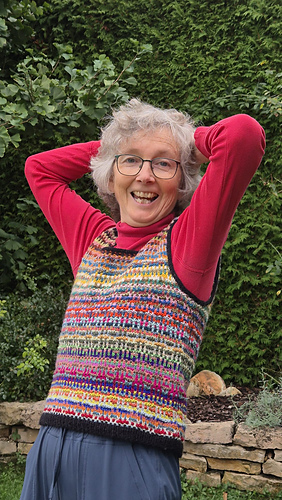 Those who know me will be aware that my favorite color is all of them, often all at once. Also that I have a bit of a squirrel tendency, and have never been known to turn down a bag of random yarn scraps – well it would be a shame if a vague acquaintance’s late great auntie Mabel’s bag of bits went to waste, wouldn’t it? As a consequence, I have always got a large quantity of leftovers and have made at least a dozen well-loved sweaters out of scraps for family members from the babies to their Great Granny.