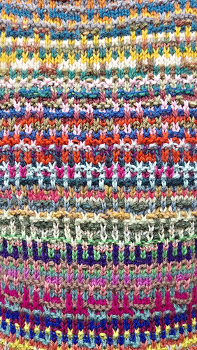 The fabric is constructed using a mix of slip stitch patterns. This can be in a repeated order, or in a random mix as you prefer. If you swap colors every couple of rows, you will achieve something rather beautiful.