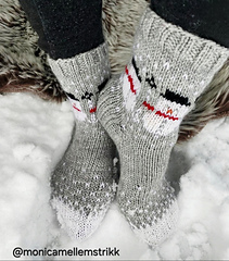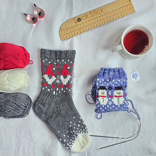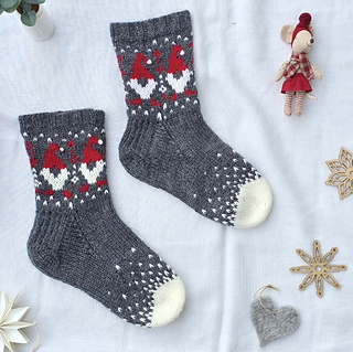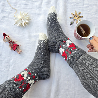 Kalle julesokker er inspirert av klassisk nordisk jul, med nisser, snømenn og snøkrystaller. Du kan velge mellom nissemønster eller snømann mønster på leggen. Sokkene strikkes i tykkere sokkegarn, og holder tærne gode og varme. Hælen strikkes med teknikken forsterket hæl, for å skape en tettere overgang mellom hæl og fot, i tillegg til at den danner en fin struktur.