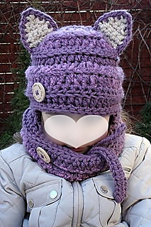 little one’s ears. Crocheted top down with a fun boucle yarn with textured pattern both on cat’s ears and cowl, result in an easy, quick garment perfect for a weekend project and for gift giving.