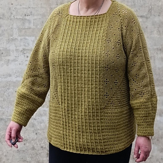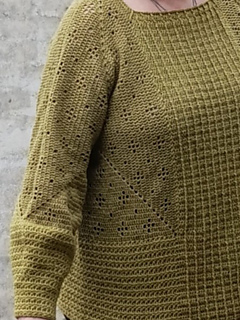 Katarina blusen hækles med tre mønsterdele. To hexagons (sekskanter) danner blusens sidestykker og ærmer, midterstykkerne hækles i reliefmønster og dernæst hækles skørtet i relief- og V-mønster. Alt er grundigt forklaret i tekst og billeder.