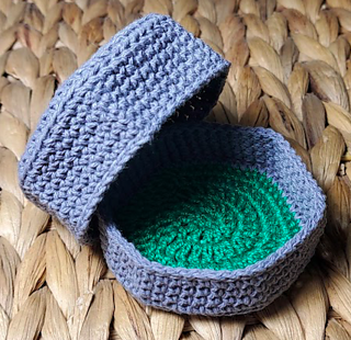 Example was made with 4 ply cotton and 2.50 mm hook and measures 7 x 2.5 cm; however could be made with any colours, yarn and hook. Base and Lid are hinged as worked.
