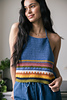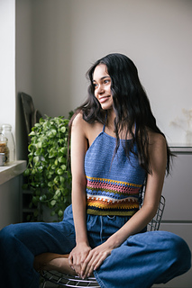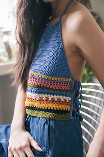 Crochet tops are summer classics, and this year they are especially trendy. This Kesätuuli Top made with Sointu yarn gets its lively look from a textured stitch pattern worked in multiple colours. The halterneck-style top is fastened with ties at the side, giving the piece a relaxed, summery feel.