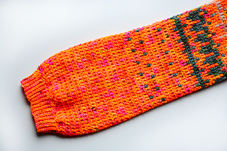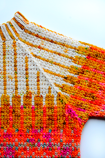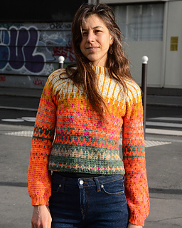 El Poncho/Sweater presenta una estructura de tejido top down con canesú raglán tejido en circular, es decir, se teje de arriba hacia abajo. Se comienza por el cuello de la pieza y se realizan cuatro líneas de aumentos para dar forma al canesú. La prenda se trabaja de manera circular y tubular. Hacia el final, la última franja del dibujo se teje únicamente en la parte delantera y trasera (en tejido plano), dejando libres los laterales y la zona correspondiente a los brazos. Esta apertura se une luego para formar una manga amplia, aunque podés optar por otras variantes según el estilo que desees lograr. El cuello puede dejarse bajo, a la altura del escote, o cerrarse mediante una serie de disminuciones, dependiendo del acabado que prefieras.