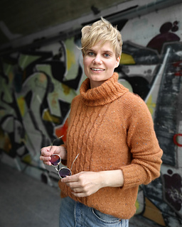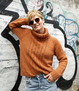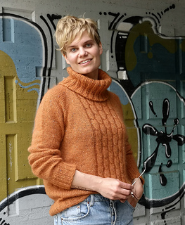 The sweater is started with a provisional cast on and worked seamlessly top down in the round, using stockinette stitch. There are short rows at the back of the neck to improve the fit. The sleeves have raglan increases. The sweater is knitted holding two strands of yarn together and it has a simple cable section decorating the front. The high, wide collar is worked last.