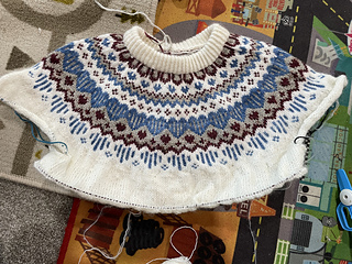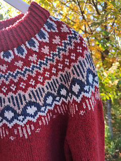 The level of the Kindhearted Sweater is advanced intermediate (4 out of 5-ish; but only because the provisional cast-on requires some concentration, and there are a couple of rounds where you have to knit with three strands on the round if you’re making a three- or four- (or more-) colored version). The pattern contains colorwork charts as well as written instructions.